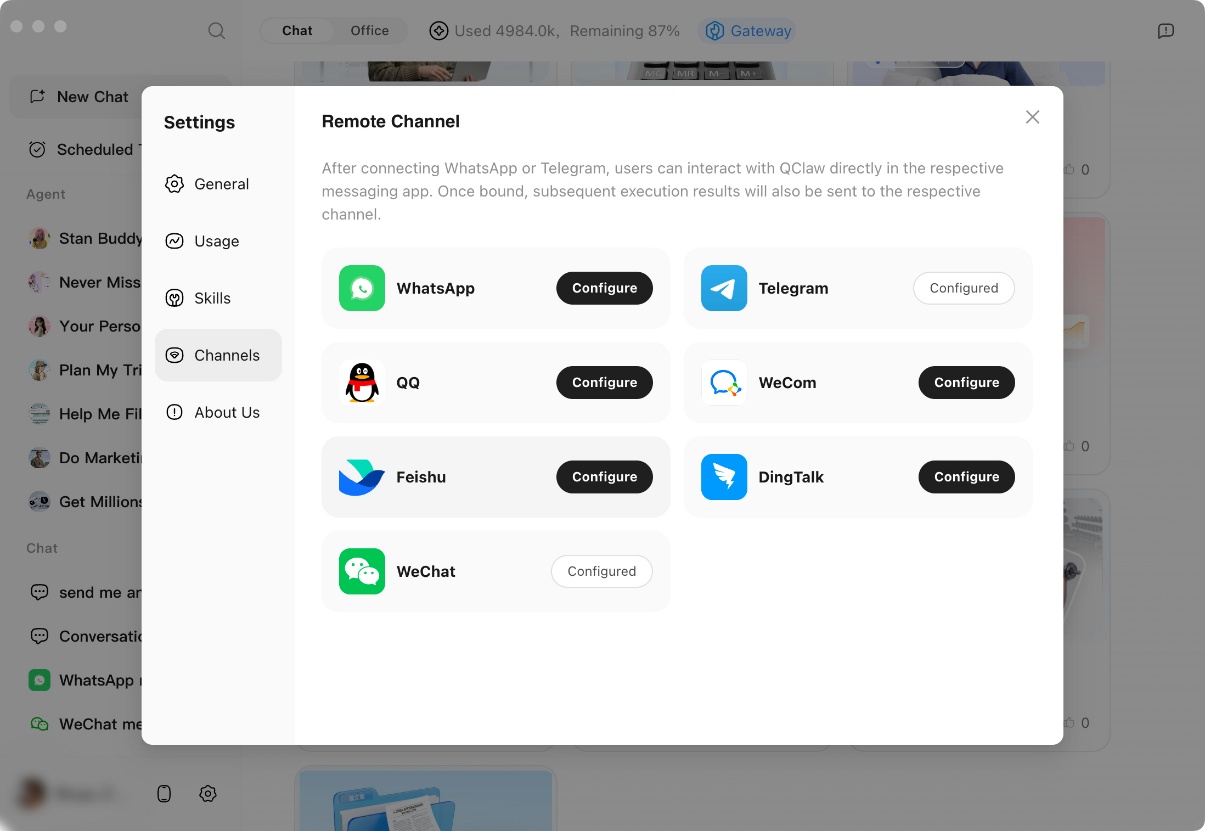 Users can connect their preferred instant messaging channels such as WhatsApp or Telegram to QClaw, enabling them to raise remote commands, prompts and instructions on their smartphones that will sync to their computers in real-time for immediate task execution.
